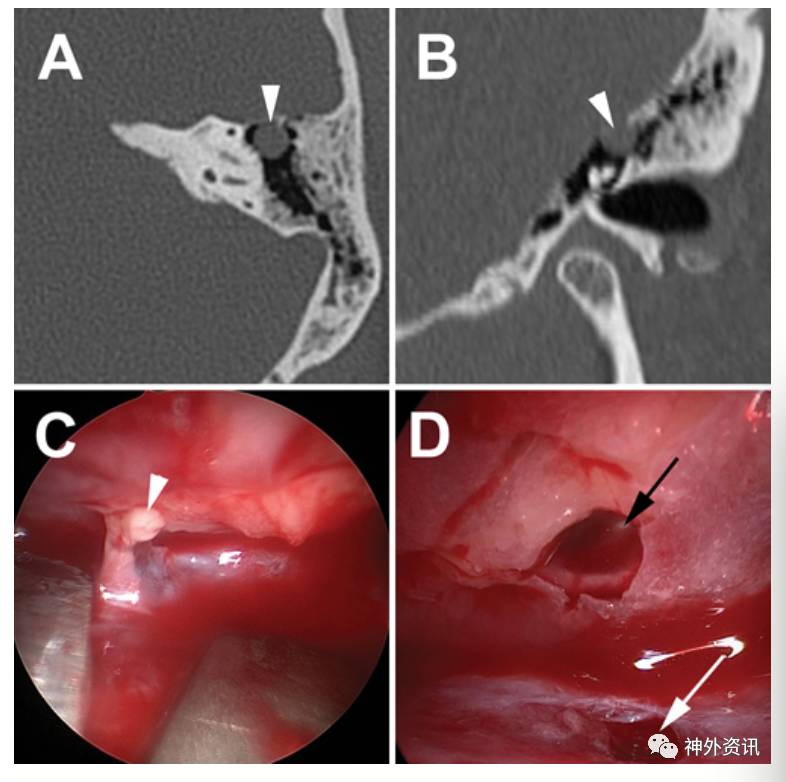 图2. A、B图为1例病例的CT轴位和冠状位图像,显示脑膨突出于鼓室上前方(箭头);C、D图为0度内镜下查看脑膨出(白箭头)和30度内镜下见硬脑膜缺损(白箭头)和鼓室盖缺损(黑箭头)。