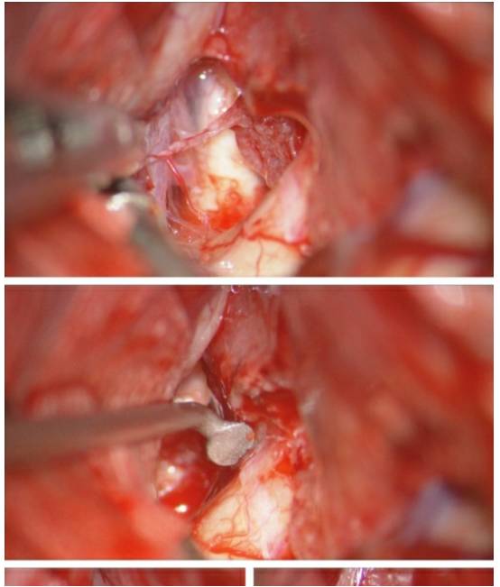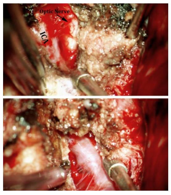 图17. 该蝶骨嵴内侧脑膜瘤的纤维样包膜很难松动,最后将肿瘤沿着ICA的长轴分为两半,才得以切除。首先在颅底识别颈动脉近端和视神经(上图)。然后将肿瘤沿着ICA的长轴切开(下图),这样有利于松动肿瘤,并最终将肿瘤的前后两部分切除。