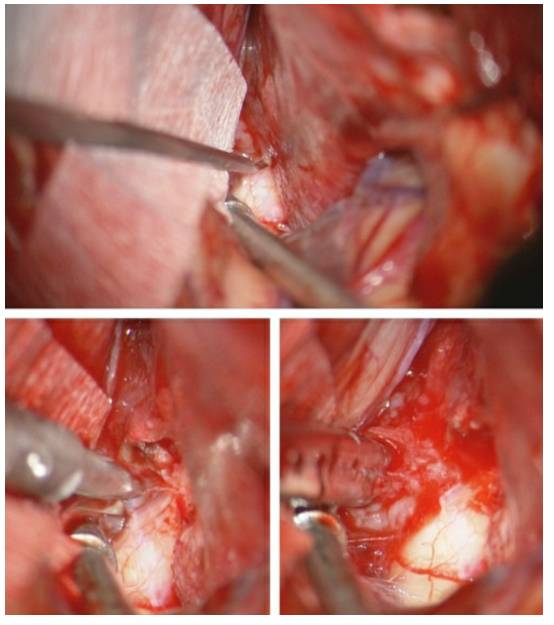图19. 图示为位于右侧视神经孔的第三组脑膜瘤(上图)。硬膜外床突切开,打开视神经的顶面(中图),为硬膜内打开镰状韧带、切除视神经管内肿瘤做准备。打开硬脑膜,抬起额叶,即可在神经内侧面看到向视神经管外延伸的肿瘤部分(下图)。