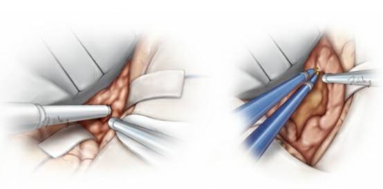 图9. 对实性肿瘤,用超声吸引器(左图)进行去核和分块减压,而对较软的肿瘤组织,用双极电凝、吸引器和垂体咬钳进行减压。接着,笔者会轻轻地牵拉肿瘤包膜,使得其塌陷入已切除的肿瘤核心处(右图)。保持在肿瘤包膜内操作是非常重要的,否则会使得粘附在肿瘤内侧脆弱的脑血管结构受损风险增加。超声吸引器使用时需远离关键血管结构,否则即便没有直接接触,仍可能导致无法修复的血管损伤。