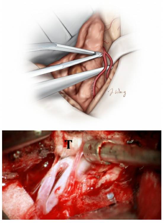 图11. 所有MCA血管均锐性方式从肿瘤包膜外游离出来,并用棉片加以保护(上图)。应尽可能避免钝性分离。最重要的是,在处理血管前应清楚地识别肿瘤的供血动脉和过路血管。可用罂粟碱浸泡的明胶海绵处理过路血管,以减轻血管痉挛。高倍放大的术中视野示范如何将M2分支血管从肿瘤(T)表面分离(下图)。