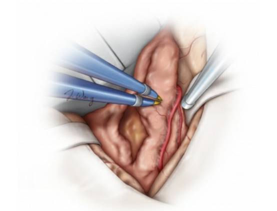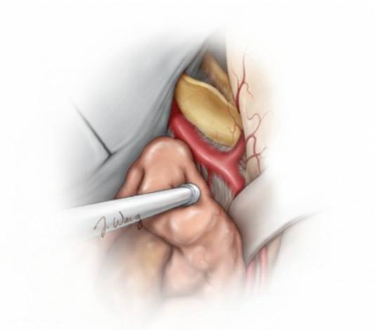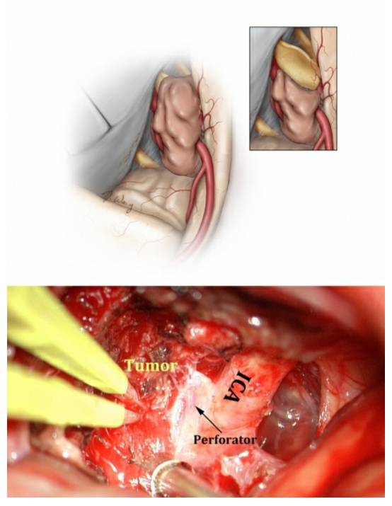 脑膜瘤手术中,第一次手术是获得治愈最好的时机。因此,正确的手术哲学应该是在安全的基础上尽可能地切除肿瘤。然而,如果肿瘤与近端ICA粘连,甚至包绕该段血管,应残留一薄层肿瘤组织。强行将粘连的肿瘤组织从该区域分离出去,将无可避免地损伤ICA内侧壁起源的小穿支血管,包括后交通动脉和脉络膜前动脉。