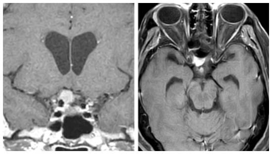 图4. 冠状位和轴位图片显示蝶骨嵴中部/内侧脑膜瘤与周围血管结构之间的典型关系。往往可发现更为明显的视器受压的证据。
