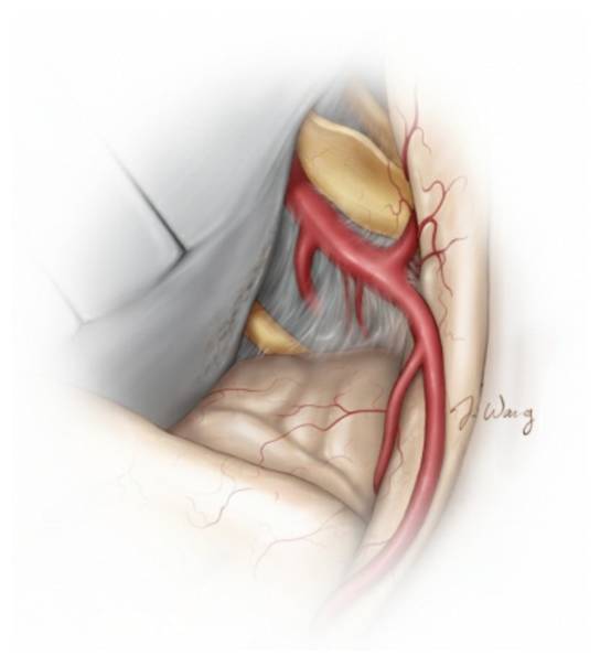 尽管在影像上,肿瘤包绕血管的现象很常见,但是肿瘤与MCA分支之间完整的蛛网膜平面有助于将血管从肿瘤表面游离出去。但是如果肿瘤与血管粘连过于紧密,应遗留一薄层肿瘤组织,以起到保护作用,避免发生血管痉挛。