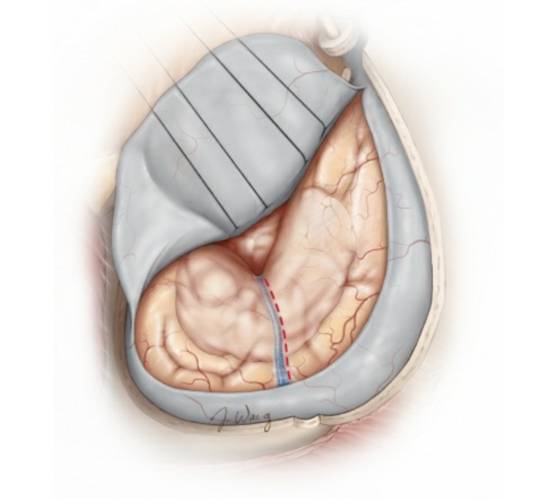 在完成上述步骤后,笔者会新月形切开硬脑膜,分离前侧裂,以暴露脑膜瘤。