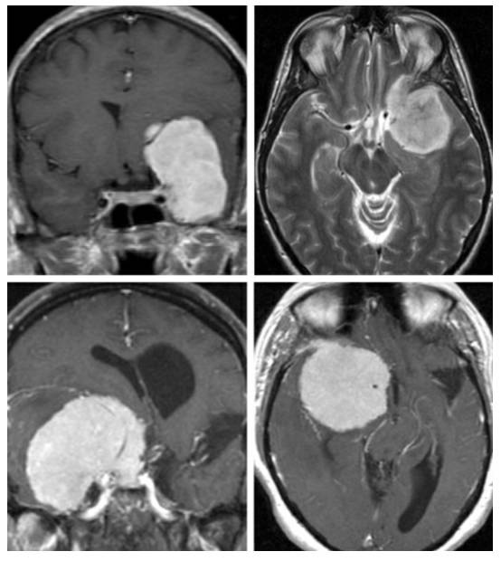 图3. 一例第三组或右侧视神经孔脑膜瘤。肿块所处的关键位置导致相对快速的视力恶化,使得肿瘤在早期得以发现。