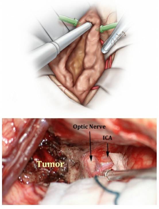 纤维样肿瘤的分离切除具有挑战性,需要借助于其他的技术将肿瘤从视神经和颈内动脉上游离出去。
