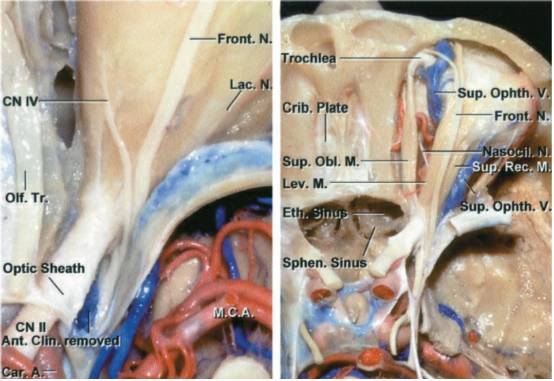 图4. 与切除蝶眶脑膜瘤有关的蝶骨周围软组织解剖。注意额神经、上睑提肌、和上直肌的位置。许多蝶骨嵴中外侧脑膜瘤侵犯眶上裂,无法全部切除(图片由AL Rhoton Jr授权)。