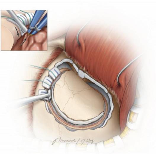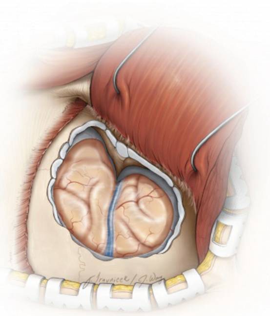 在手术开始获得的颅骨膜覆盖硬脑膜缺陷并缝合。