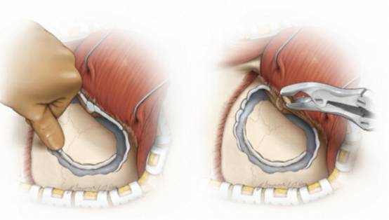 图11. 如果肿瘤显著侵入大脑皮层、硬脑膜、和颅骨,后两层可能不得不完整抬起。首先沿骨窗边缘切开硬脑膜,分离下方附着的肿瘤与大脑的粘连,再抬起整块颅骨。这个操作适于小型浅表肿瘤。