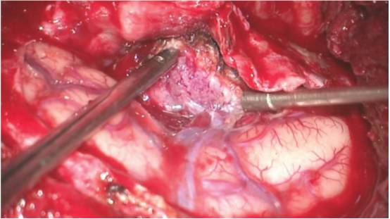 经翼点开颅切除蝶骨嵴中外侧脑膜瘤。根据肿瘤浸润硬脑膜的程度,用神经导航(MR和CT)指导开颅范围。肿瘤的硬脑膜尾应该积极尝试切除。如果硬脑膜被严重浸润,在开颅时应留取骨膜,手术结束时用来重建缺损的硬脑膜。