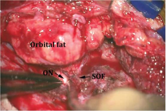 图9. 在硬膜外磨除内侧蝶骨嵴和前床突后,辨认眶上裂(SOF)和视神经(ON)。在这个阶段,要用术中CT导航指引切除骨质。如果肿瘤延伸到眶部,进一步切除眶上和外侧壁,并切除扩展入眶内的肿瘤。在手术结束需要一个植入物重建眶壁以避免延迟眼球内陷。
