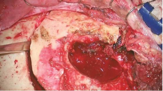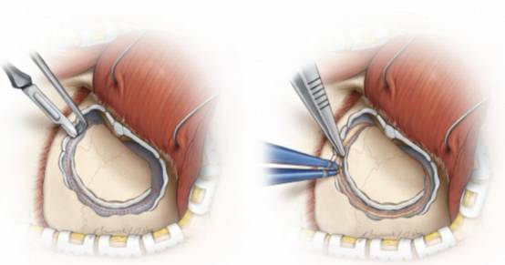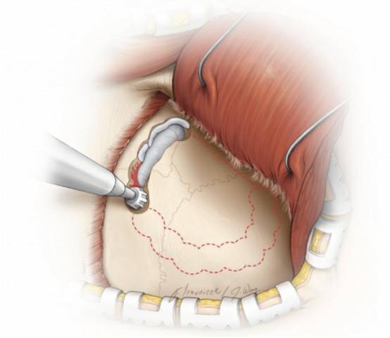 图5. 随着肌皮瓣的翻开,笔者使用一个大的钻头磨除集中覆盖翼点的增生的颅盖骨;不急于形成骨瓣(上图,右侧入路对应于图1中的下图),而是在肿瘤浸润的骨质边缘进行多个钻孔,再用咬骨钳将这些骨孔连接(下图)。增生的骨质富含血管,直接形成骨瓣并抬起它常会导致大出血。此外,肿瘤浸润的骨质和硬脑膜相互粘连,骨瓣抬起时会导致大脑皮层撕裂伤。