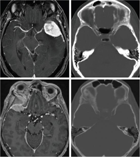 图1. 上图为一个典型的左侧外侧蝶骨嵴脑膜瘤伴骨质增生。下图为右侧蝶眶脑膜瘤伴显著的蝶骨嵴、床突和眶壁增生,导致眼球突出。为长期的控制肿瘤并改善眼球突出,有必要同期切除硬膜内肿瘤和增生的骨质。