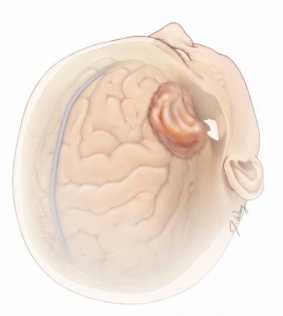 一些脑膜瘤可能广泛浸润到硬脑膜和颅骨。