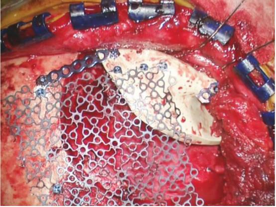 图14. 用定制的植入物用于重建眶缘和部分眶壁,注意避免压迫眼肌运动。用钛网修复颅盖骨残余缺损。肿瘤浸润的骨瓣不能回纳。