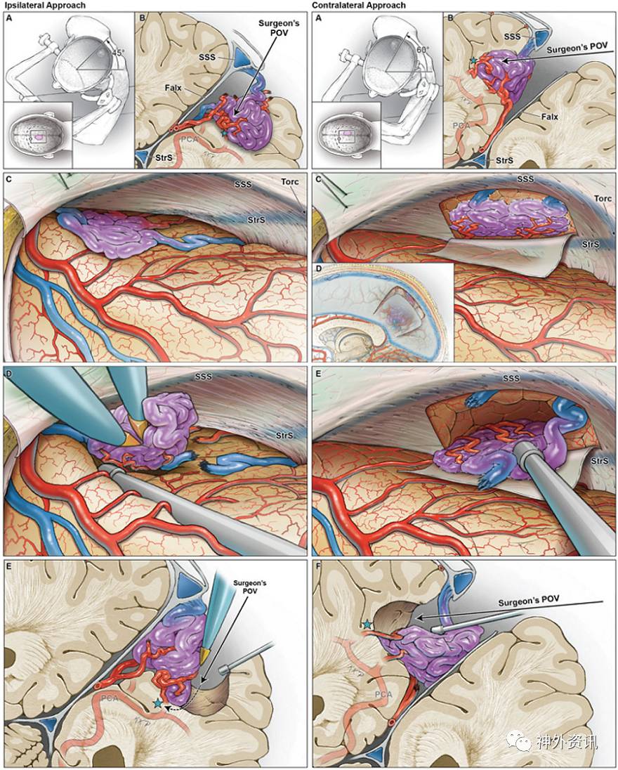 图1. IPIA(左)和CPIA(右)切除AVM的手术步骤。在示意图中,紫色区域为病变,虚线为切口,圆形为骨孔,实线则为骨窗。左图:A.IPIA,头位使中线呈水平。AVM位于左侧,在下方,头转45度。B.冠状位图:术者的视野几乎是垂直于大脑半球内侧面,病变的外侧缘不在视野范围内,除非牵拉或切除部分脑组织。C-E.术者的视野,(C)暴露AVM的内侧边界以及来自左侧大脑后动脉的供血动脉,(D)使用固定牵拉器将脑叶牵开或(E)切除病变外侧缘的部分脑组织,将畸形团向上方(纵裂方向)翻起。右图:A.CPIA,头位使中线呈水平。AVM位于右侧,在上方,头转30°使大脑镰与水平线呈60°角。B.冠状位图:术者的视野在右大脑半球内侧面水平,可见病变部分外侧边界,无需固定牵拉或切除脑组织。C和D.切开大脑镰,可清楚显示右顶枕叶内侧面AVM和来自大脑后动脉的供血动脉。E和F.电凝和切断大脑后动脉的供血动脉后,分离畸形团随重力落至纵裂和大脑镰上。该入路可直视分离过程中的病变外侧边界。