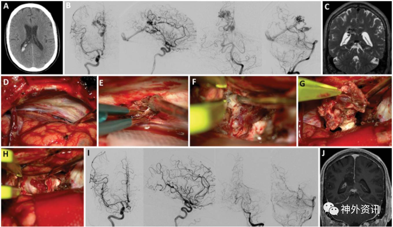 图2. A.术前CT提示右顶叶内侧面脑室旁AVM破裂致右侧脑室出血。B.术前DSA前后位、侧位以及C.MRI-T2加权冠状位提示AVM靠近右侧胼胝体压部,由右侧脉络膜后外侧动脉和大脑后动脉压部动脉的分支供血,供血动脉还有右侧胼周动脉和胼缘动脉远端。D-H.术中照片显示在CPIA下,(D)从对侧观察大脑镰,(E)打开大脑镰,(F)分离并切除AVM,(G)完整取出AVM,(H)未见残留。I和J.术后DSA前后位、侧位及MRI-T1增强冠状位影像提示AVM无残留。
