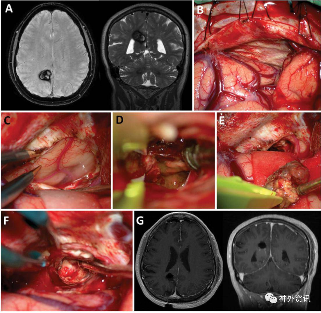 图3. A.术前MRI-T2轴位和冠状位提示右侧楔前叶内侧面CCM。B和C.术中照片显示在CPIA下,(B)打开对侧纵裂,(C)切开大脑镰。D-F.(D和E)CCM完全切除,(F)无残留。G.术后MRI-T1加权轴位和冠状位增强影像提示CCM无残留,发育异常的静脉完整保留。