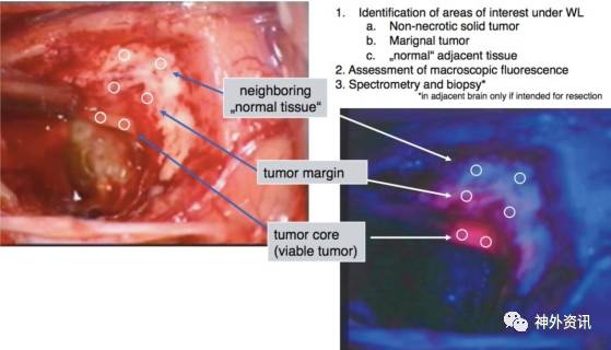 图1. 肿瘤核心、肿瘤边界和邻近白质区域的定位和光谱测定。