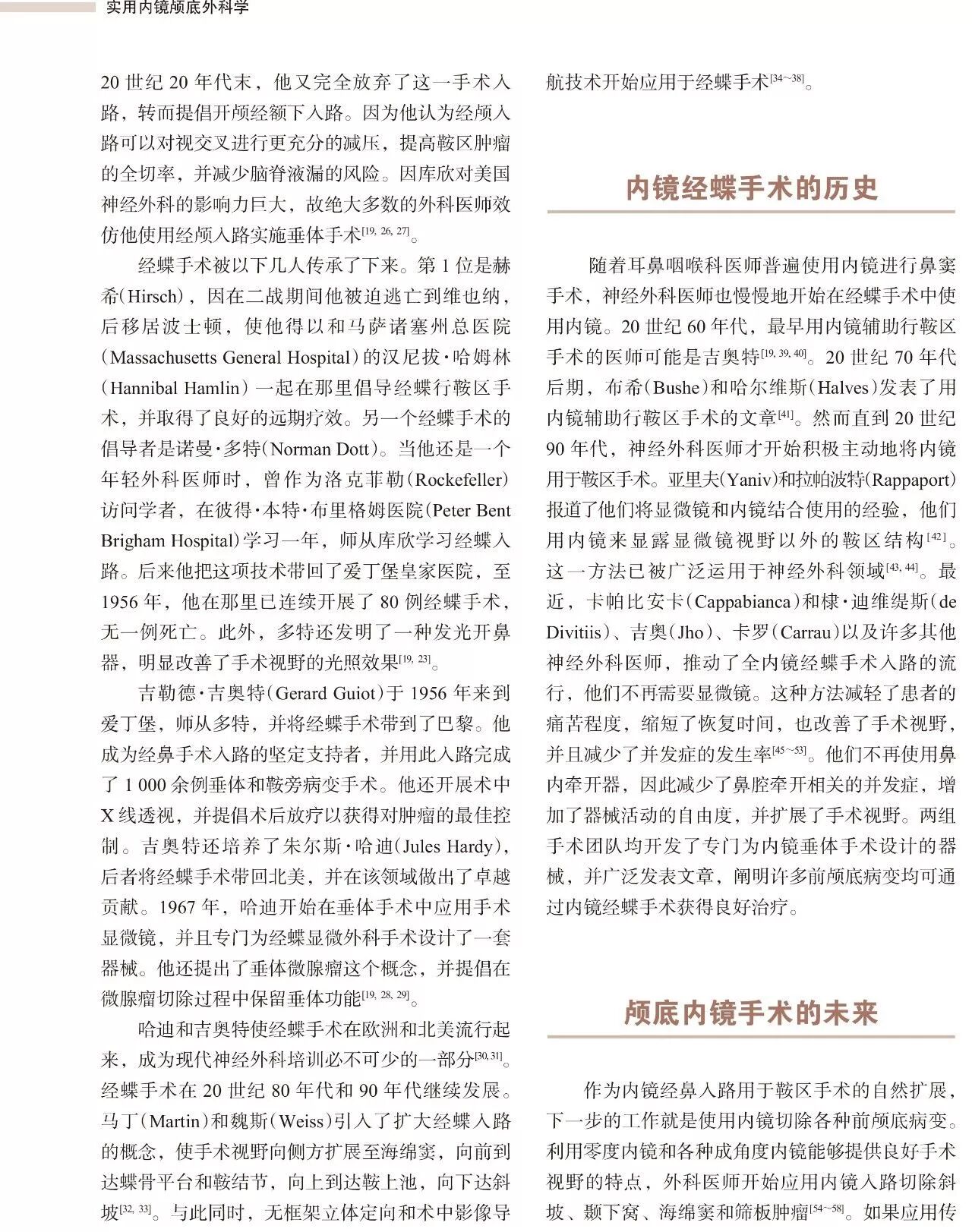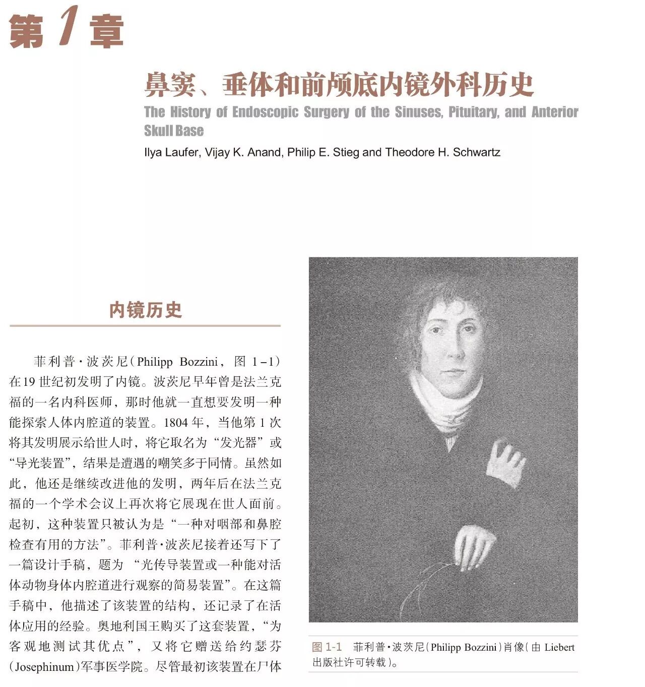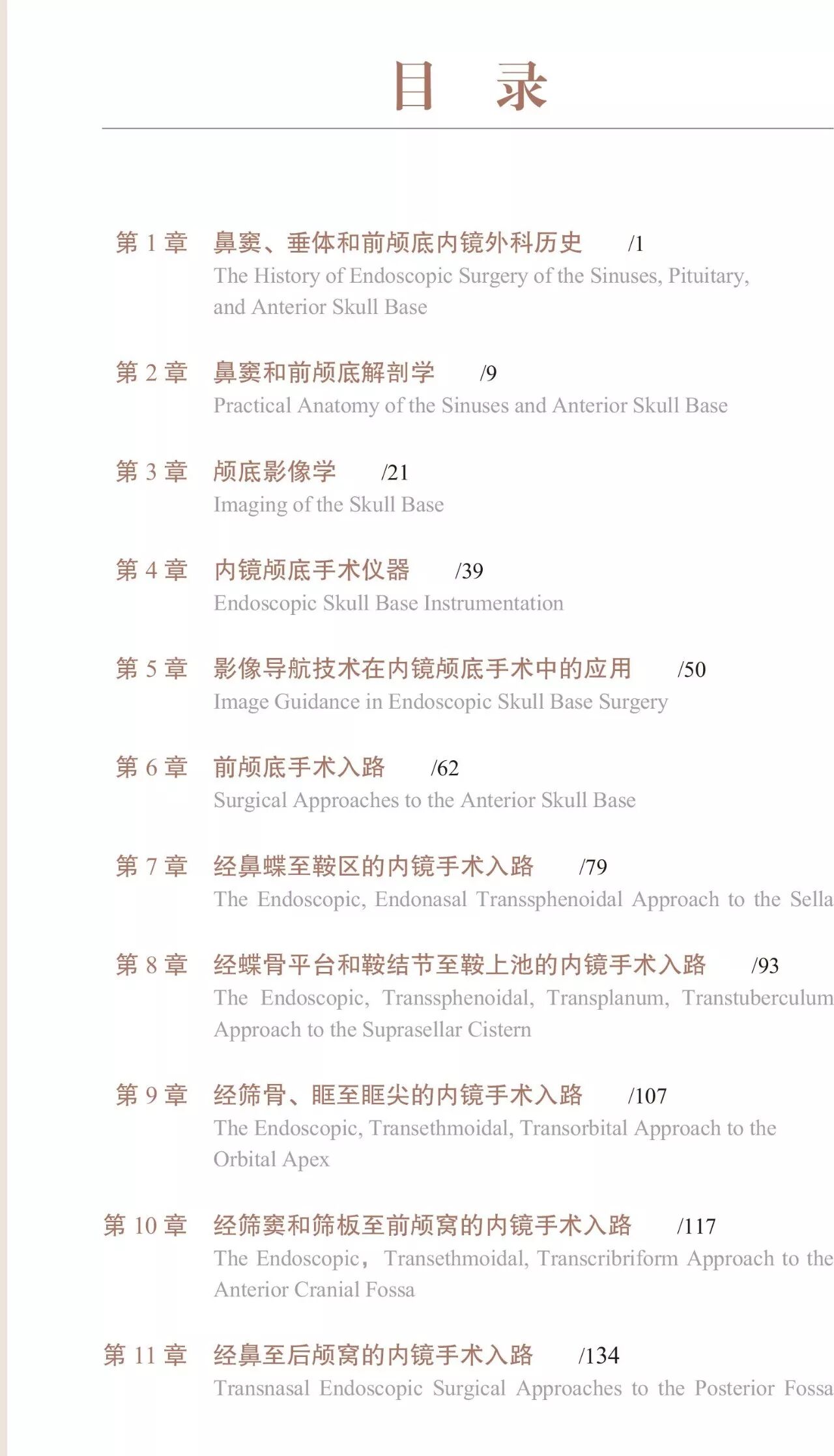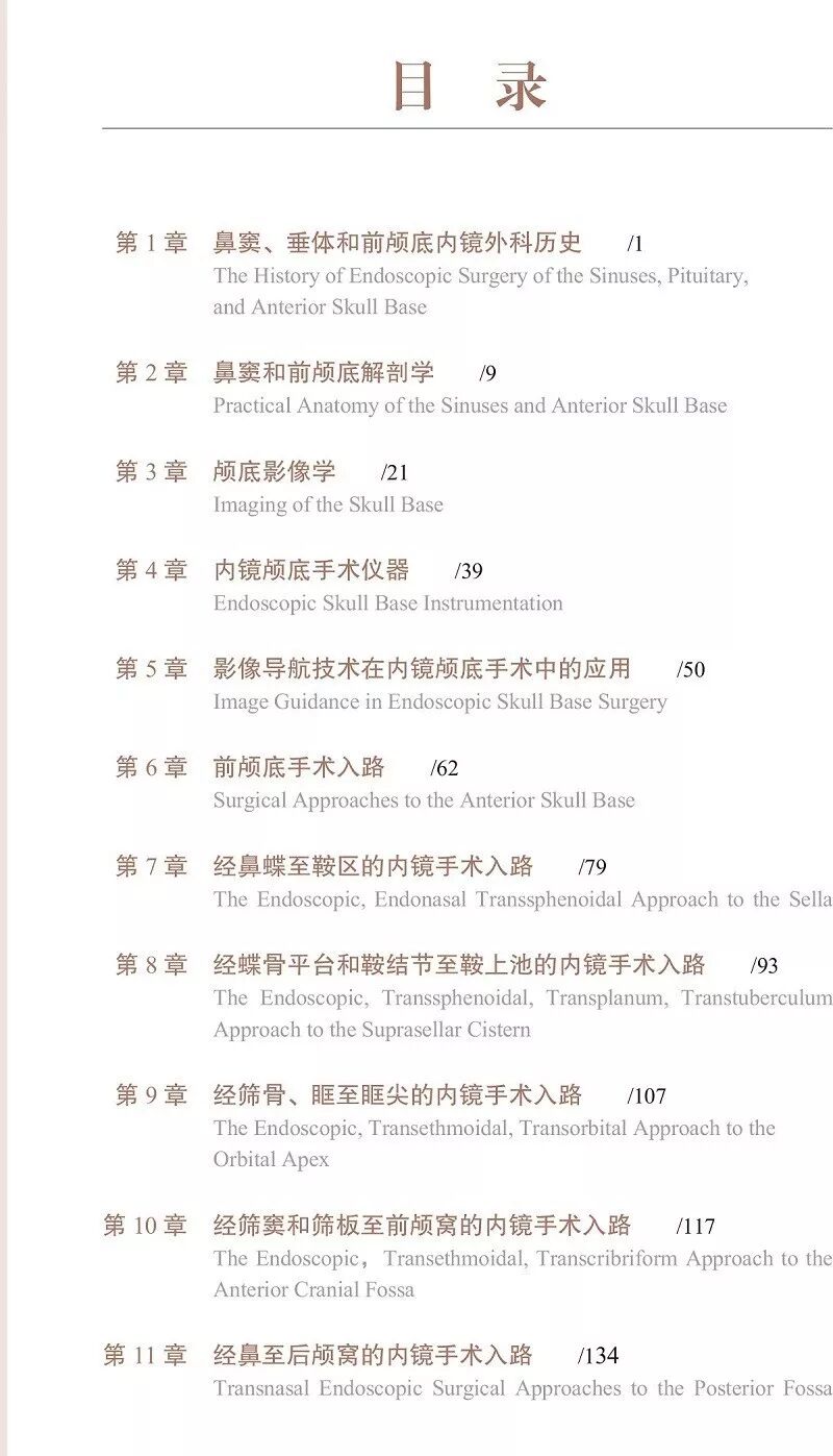 为推广颅底神经内镜技术,提高颅底外科的微创手术治疗水平,长征医院神经外科特推出由纽约长老会医院阿南德博士和施瓦兹博士撰写、长征医院神经外科侯立军教授等组织编译的《实用内镜颅底外科学》一书。本书前5章介绍了鼻窦、垂体和前颅底内镜外科的历史、鼻窦和前颅底解剖学、颅底影像学、内镜外科手术器械设备和内镜颅底外科影像导航技术,作为进一步阐述内镜颅底外科的基础和知识准备;后8章分别论述了前颅底的内镜手术入路,经鼻蝶至鞍区的内镜手术入路,经蝶骨平台和鞍结节到达鞍上池的内镜手术入路,经筛骨和眶至眶尖区的内镜手术入路,经筛窦和筛板到达前颅窝的内镜手术入路,经鼻到达后颅窝的内镜手术入路,经鼻和翼突的内镜手术入路,以及经鼻至海绵窦的内镜手术入路;最后3章讲述内镜颅底外科术后重建、经鼻内镜颅底外科的并发症以及经鼻蝶内镜手术的术后管理等问题。本公众号将分批推送本部专著的内容,欢迎神经外科同道订阅查看。