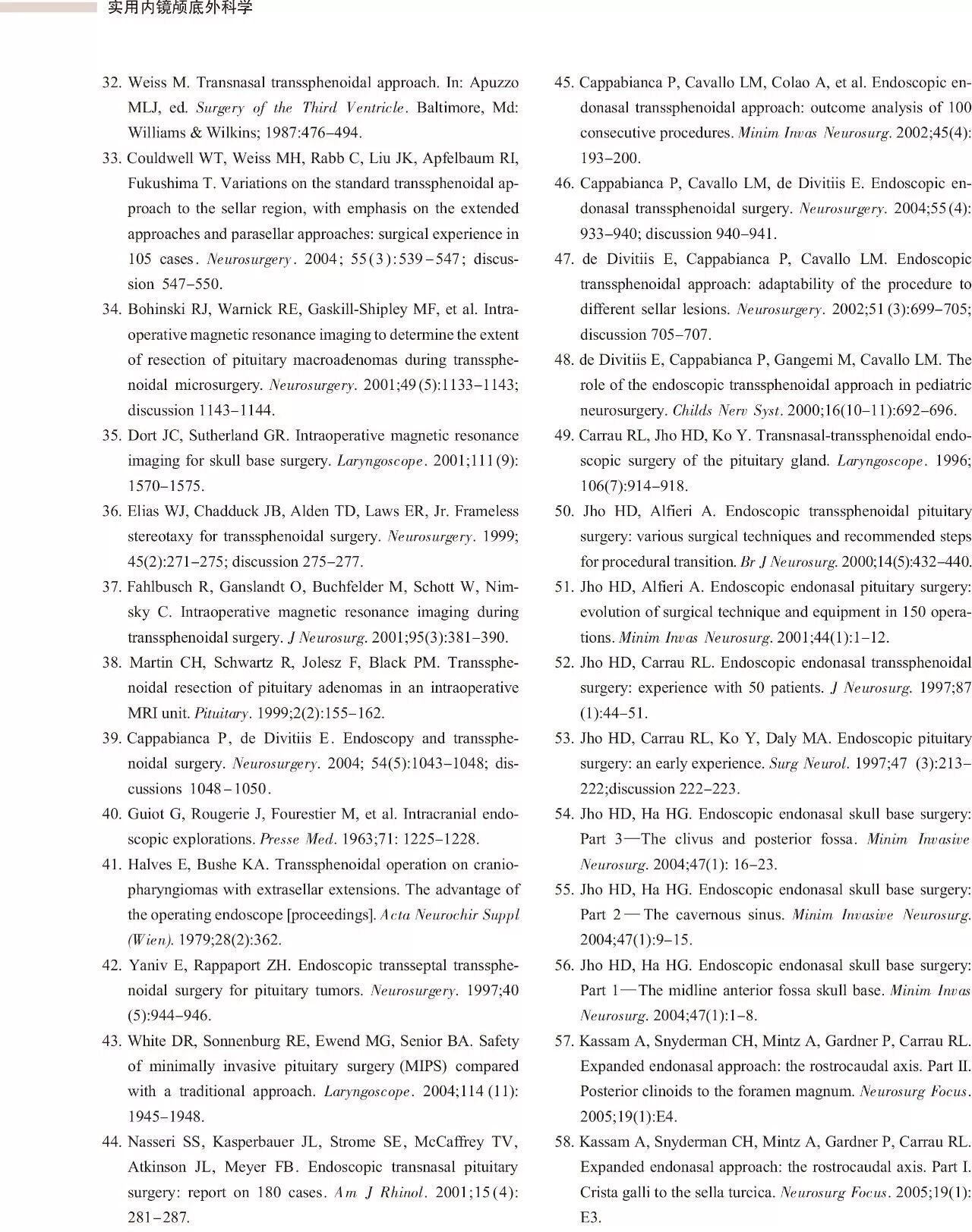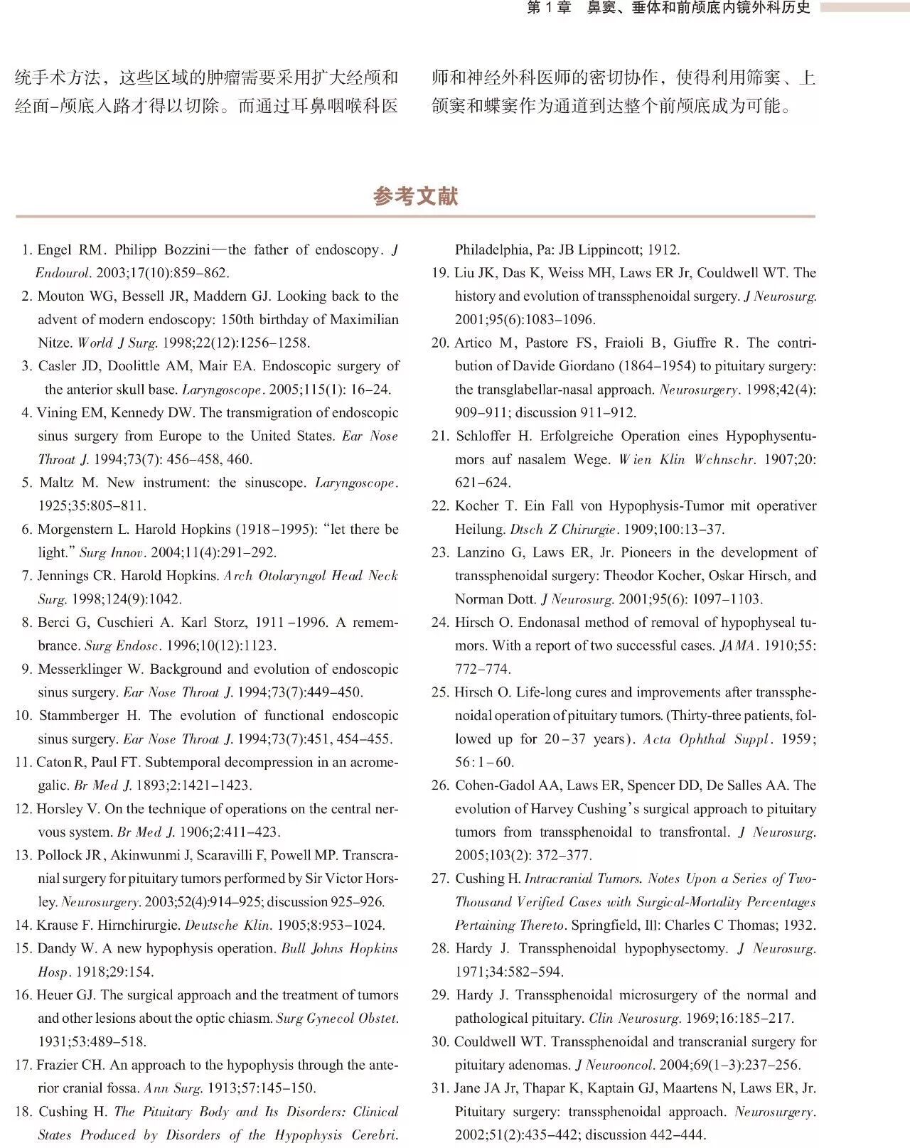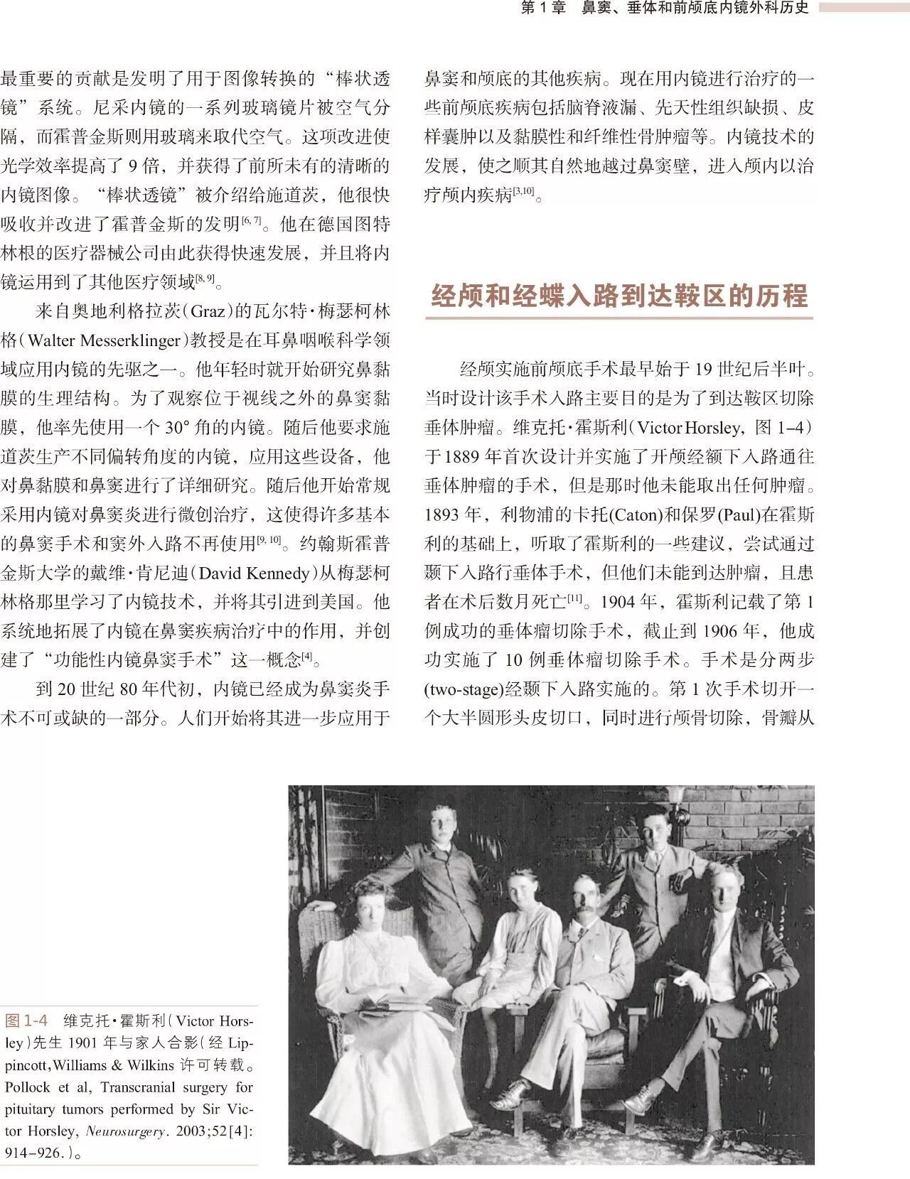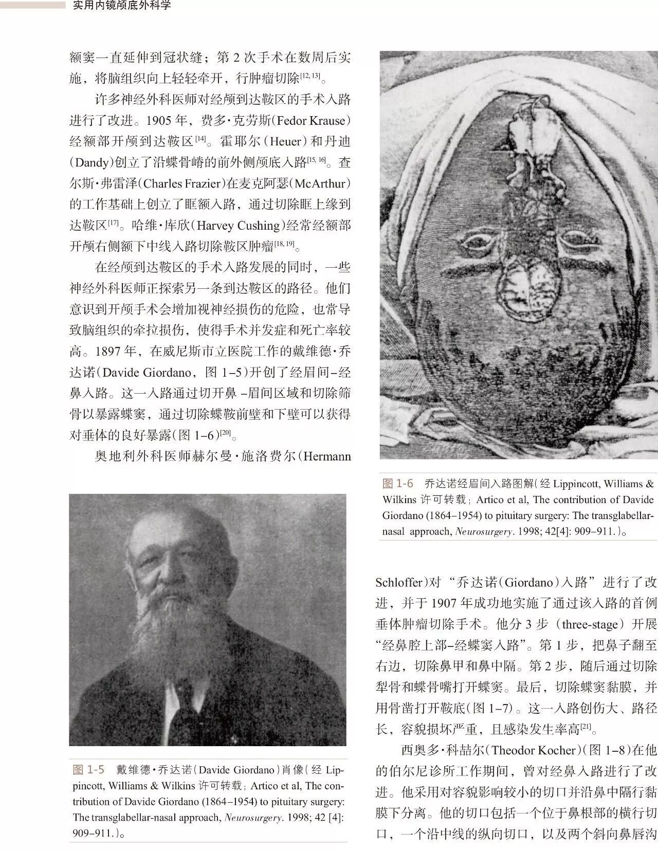 为推广颅底神经内镜技术,提高颅底外科的微创手术治疗水平,长征医院神经外科特推出由纽约长老会医院阿南德博士和施瓦兹博士撰写、长征医院神经外科侯立军教授等组织编译的《实用内镜颅底外科学》一书。本书前5章介绍了鼻窦、垂体和前颅底内镜外科的历史、鼻窦和前颅底解剖学、颅底影像学、内镜外科手术器械设备和内镜颅底外科影像导航技术,作为进一步阐述内镜颅底外科的基础和知识准备;后8章分别论述了前颅底的内镜手术入路,经鼻蝶至鞍区的内镜手术入路,经蝶骨平台和鞍结节到达鞍上池的内镜手术入路,经筛骨和眶至眶尖区的内镜手术入路,经筛窦和筛板到达前颅窝的内镜手术入路,经鼻到达后颅窝的内镜手术入路,经鼻和翼突的内镜手术入路,以及经鼻至海绵窦的内镜手术入路;最后3章讲述内镜颅底外科术后重建、经鼻内镜颅底外科的并发症以及经鼻蝶内镜手术的术后管理等问题。本公众号将分批推送本部专著的内容,欢迎神经外科同道订阅查看。