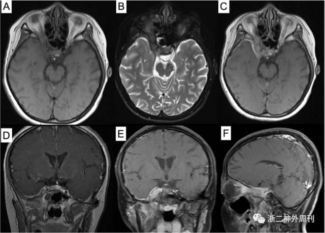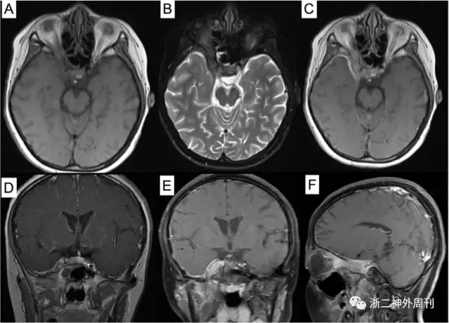 图1. 术前MRI检查:A)T1加权轴位;B)T2加权轴位;C)增强像轴位;D-E)增强后冠状位和F)矢状位示右眶尖-海绵窦-颞下窝病变,呈等T1、略长T2信号,增强后明显强化,邻近脑膜增厚伴强化。