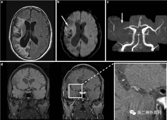 图10. 中枢神经系统血管炎的MRI和MRA表现:A)在右大脑中、后动脉区域显示亚急性缺血等老年缺血性病变(弥散加权成像:B,白色箭头);C)MRA显示右侧大脑中动脉闭塞;D)相应的血管壁强化。
