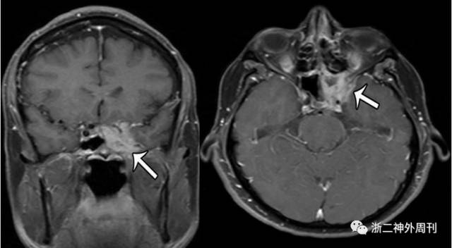 协和医院最终出院诊断为头痛原因不明,中小血管炎可能。予美卓乐4mg qd,后加用甲氨蝶呤 4片 qw口服治疗。1年后患者复查头颅MRI示右侧眶尖-海绵窦病变较前缩小缓解(图3)。目前仍在继续随访中。