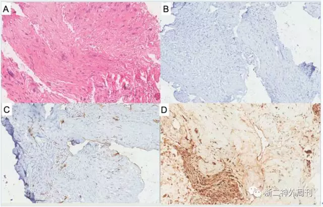 图2. 病理及免疫组化:A)H-E染色下见梭形细胞呈纤维母细胞/肌纤维母细胞样并形成长束状,伴多种炎性细胞浸润;B)免疫组化染色示ALK-noneLung阴性;C)SMA血管 +;D)S-100神经+。
