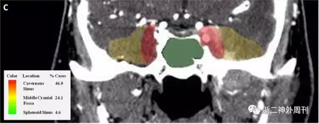 发生于颅内的IMT较为罕见,颅内IMT多见于眶内和颅底[1,2]。Desai SV等[3]总结了33篇文献共计87例发生于鼻窦和颅底腹侧面的IMT,得出IMT在颅底的分布热图(图4)。