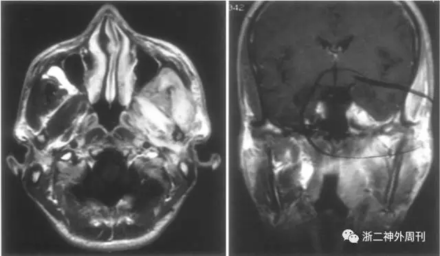 图8. 韧带样纤维瘤MRI表现:位于左侧颞下窝的增强明显的肿物,呈浸润性生长,侵犯Meckel腔、Dorello管和海绵窦。
