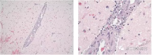 本病例协和医院的病理诊断认为应考虑血管炎可能。中枢神经系统血管炎是指一类累及中枢神经系统的炎性血管病。多数和自身免疫异常有关,微生物的直接感染也逐渐成为重要的致病因素。