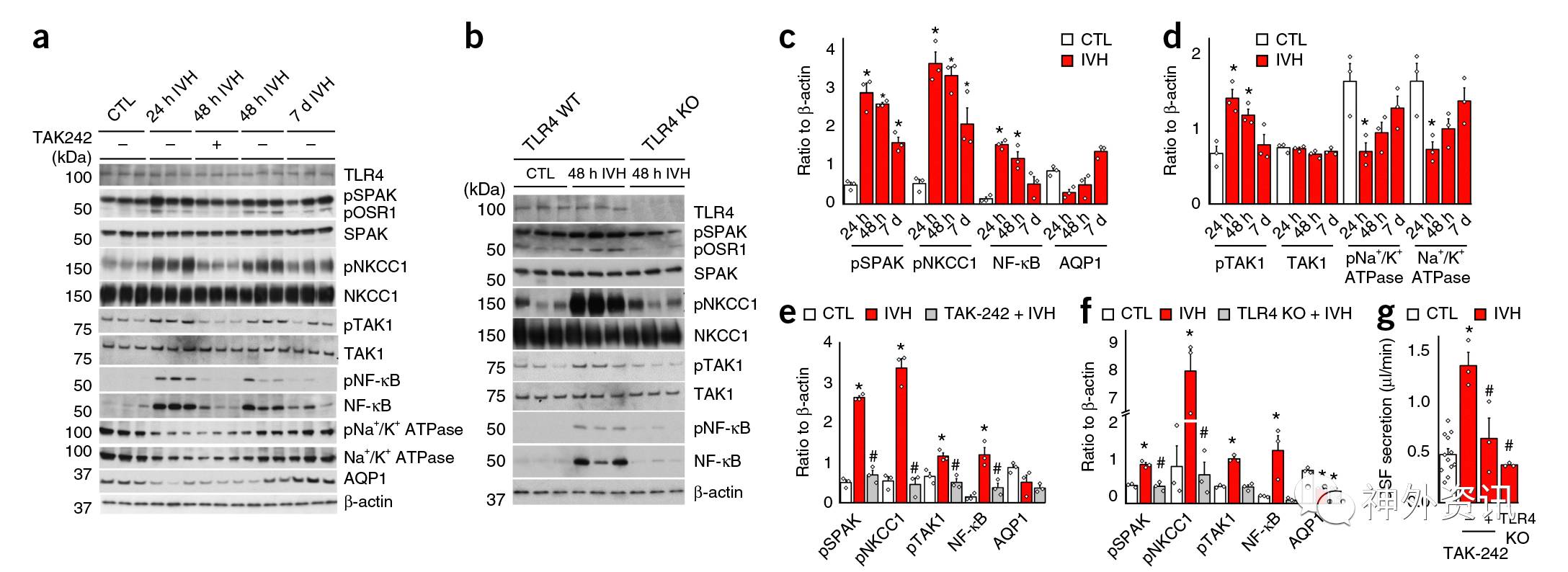 图3. IVH后SPAK-NKCC1上调导致脑脊液过度分泌必需依赖TLR4-NF-κB信号通路。a.Western blot显示,在有或无TLR4阻断剂TAK-242的情况下,对照组与IVH组大鼠在24、48小时和7天时CPE裂解液中各种铁离子转运体蛋白表达情况。b.Western blot显示,TLR4野生型和TLR4基因敲除的大鼠CPE中,各种铁离子转运体蛋白的表达情况。c、d、e和f.为半定量的柱状图。g.TLR4野生型、TLR4野生型+TAK-242和TLR4基因敲除大鼠在IVH后48小时的脑脊液分泌情况。