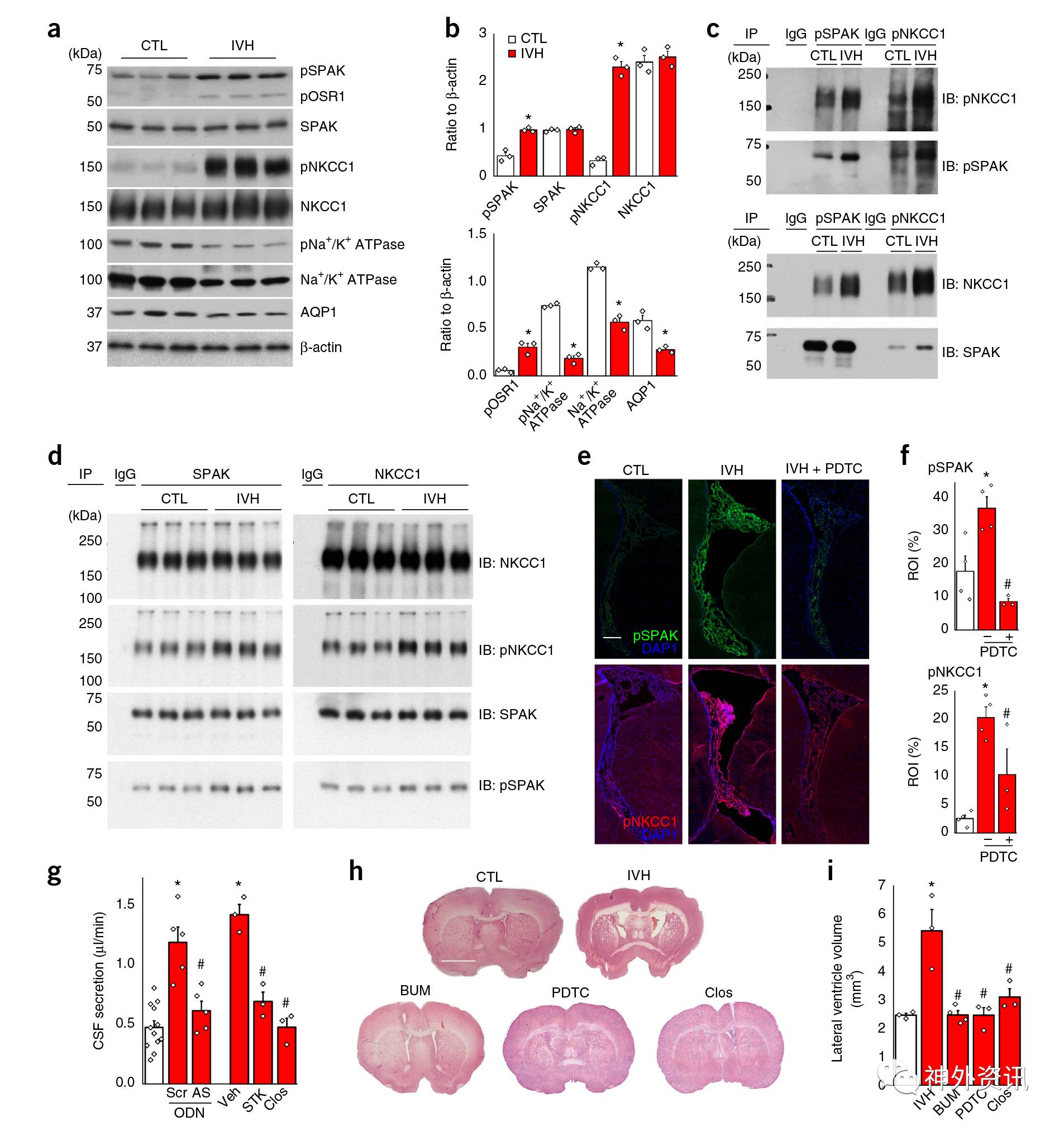 图2. IVH后炎症反应诱导CPE的SPAK-NKCC1复合体磷酸化和激活,导致脑脊液分泌过多。a.Western blot显示对照组和IVH组在48h的大鼠CPE裂解液中各种铁离子转运体蛋白表达情况。b.为Western blot的半定量柱状图。c.CPE裂解液中pSPAK和pNKCC1的免疫共沉淀结果;上图为pSPAK和pNKCC1,下图为总的SPAK和NKCC1;p表示磷酸化。d.CPE裂解液中SPAK和NKCC1的免疫共沉淀结果。e.荧光双标显示对照组、IVH组和PDTC组大鼠的pSPAK(绿色)和pNKCC1(红色)蛋白表达情况;蓝色为DAPI,细胞核。f.为e图荧光强度的半定量柱状图。g.基因敲除或药物阻断SPAK后IVH组脑脊液分泌情况。h.大鼠冠状切面HE染色图片显示脑室内注射各种药物后脑室大小。i.为h图脑室体积定量柱状图。