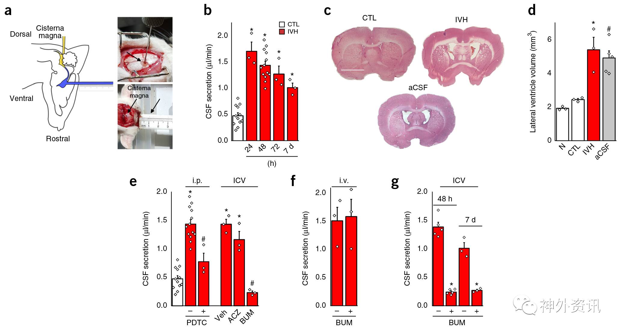 图1. IVH引起的炎症反应可促使CPE过度分泌脑脊液,该过程可被布美他尼(NKCC1共转运体阻断剂,BUM)阻断。a.左图.大鼠体内脑脊液定量测定法示意图。黄色表示导管注射矿物油至第四脑室和中脑导水管,以阻断脑脊液循环。蓝色表示毛细导管插入侧脑室,靠近矿物油梗阻处,收集侧脑室CPE分泌的脑脊液;右上图.大鼠顶部开颅,立体定向下侧脑室注射血液或人工脑脊液,作为对照组,箭头代表注射部位,可见脑脊液流出;右下图.在活体wistar大鼠上直接测量脑脊液量,左侧箭头所指导管用于矿物油注射,右侧箭头所指为毛细导管和用于测量脑脊液的标尺。b.Vehicle对照组,仅作侧脑室穿刺,不注射任何物质,大鼠和大鼠IVH 24、48、74h和7d时脑脊液分泌率的柱状图。c.不同实验组大鼠冠状切面HE染色,可直接反映侧脑室体积;CTL代表vehicle对照组,IVH代表脑室出血后48小时,aCSF代表人工脑脊液注射对照组。d.不同实验组侧脑室体积定量柱状图。e.IVH后立即、每隔8小时,直至48小时,向脑室内注射碳酸酐酶抑制剂乙酰唑胺或NKCC1共转运体抑制剂布美他尼或腹腔注射NF-κB抑制剂PDTC,观察IVH后48小时脑脊液分泌率。f.静脉注射布美他尼对脑脊液分泌无明显影响。g.脑室内注射布美他尼可显著减少脑脊液分泌。
