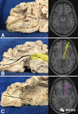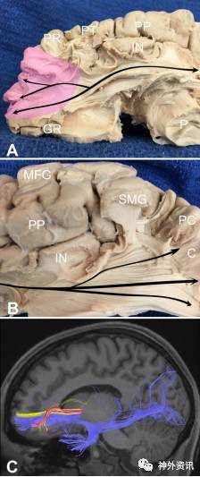 图3. OFG纤维束在颞叶、顶叶和枕叶投射。A.右侧大脑半球矢状位纤维束解剖,粉色表示在OFG的联系;B.纤维束向后内侧与枕叶皮质相连;C.MRI-T1矢状位成像示,大脑前部额底纤维束向颞、顶和枕部投射分布。