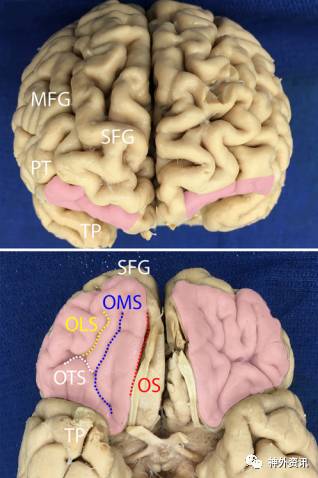 图1. 上图.OFC表面观,OFC位于额上回(superior frontal gyrus,SFG)和额中回(medial frontal gyrus,MFG)的下部及额下回三角部(pars triangularis,PT)中下部。下图.OFC底面观,眶内侧回位于嗅沟(olfactory sulcus,OS)外侧和眶内侧沟(medial orbital sulcus,OMS,蓝色虚线)内侧。眶外侧回位于眶外侧沟(lateral orbital sulcus,OLS,黄色虚线)外侧和眶横沟(transverse orbital sulcus,OTS,白色虚线)前外侧。眶前回(anterior orbital gyrus)位于OLS和OMS之间。粉红色区:OFC;TP:颞极。