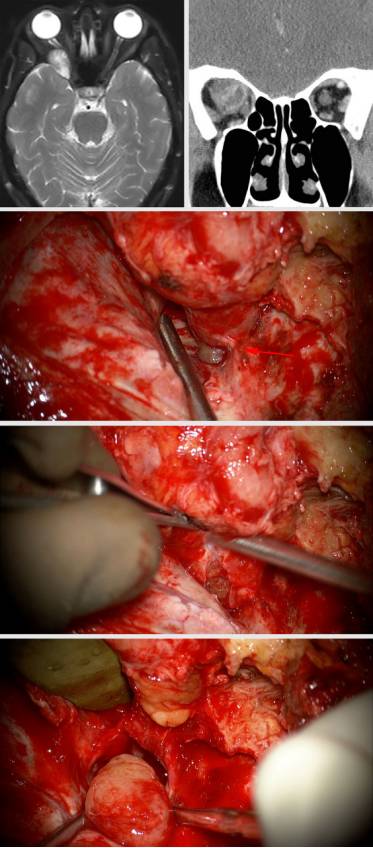在肿瘤上方打开眶筋膜避开上直肌和上睑提肌。个别肿瘤会通过视神经管长进颅内,这时就需要切开额部的硬膜。松解镰状韧带以进一步减压视神经管处的视神经。