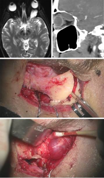 图6. 通过眶上入路单瓣眶壁截骨(中图)切除位于眼眶上部并导致突眼的神经鞘瘤。注意肿瘤表面的神经起源(底图)。