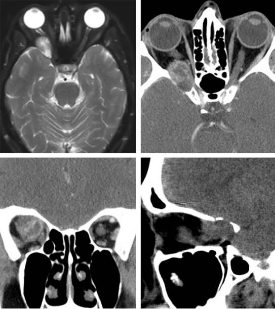 图1. 眶后上部的锥外型神经鞘瘤。可见视神经被内移和眶顶骨质受压侵蚀。