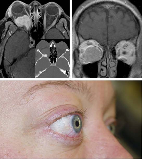 图2. 眼球突出是眼眶肿瘤最常见的症状,图示是一例以此为表现的右眶脑膜瘤,肿瘤的位置及纤维样的质地决定了必须采用眶颧入路进行切除。