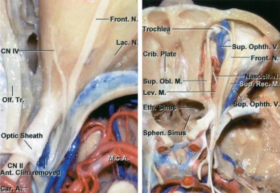 额神经走形于上睑提肌和上直肌上表面,透过眶筋膜可以看到。而滑车神经由外向内跨越视神经后也在同一平面走形最终到达上斜肌。