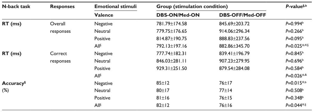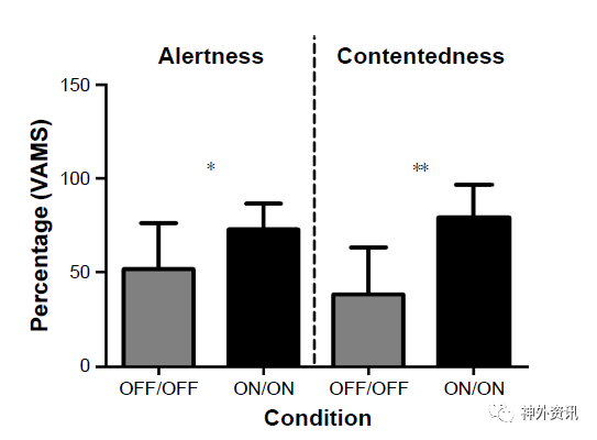 作者对16例STN-DBS术后1年的PD患者进行分析(表1),分别评估开机(DBS-ON)/服药(Med-ON)和关机(DBS-OFF)/停药(Med-OFF)状态时,情绪视觉模拟量表(VAMS)和2-back情绪、工作记忆任务指标等的变化。结果表明,在16例患者中,DBS-ON/Med-ON与DBS-OFF/Med-OFF时比较,对工作记忆任务的敏锐性 (meanoff/off =51.59±24.54; meanon/on=72.75;P=0.016)和满足感(meanoff/off=38.73±24.41;meanon/on=79.01±17.66;P=0.001)均提高,对情绪有缓解作用(图1)。在DBS-ON/MeD-OFF亚组的7例患者作进一步分析,结果是短期停药有减轻情绪的影响作用。在忽略刺激参数的情况下,DBS-ON/Med-ON与DBS-OFF/Med-OFF相比,N-back任务的准确率明显提高,分别为82.0%比76.0% (P=0.044)(表2)。