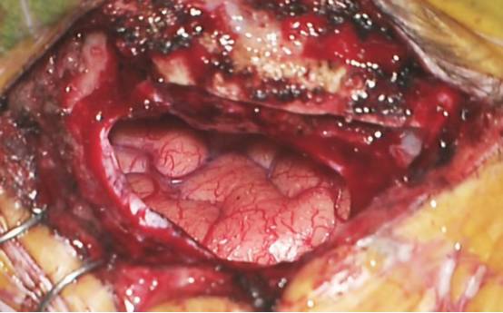 图11. 避免使用固定脑压板以免损伤额叶底面皮层。能看到一例大型前交通动脉瘤夹闭后额叶底面的情况。水密性连续缝合硬膜,额窦开放时尤须如此。骨膜瓣可用于修补缝合硬膜或反转覆盖开放的额窦。若额窦未开放,硬膜水密性缝合并非必须。