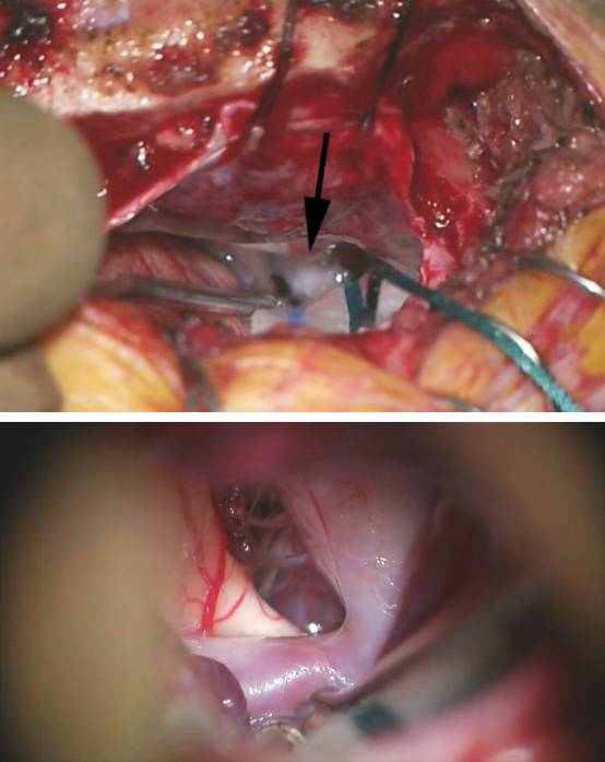 图10. 打开硬膜,轻柔地抬起额叶,在术野深处(上图)可见视神经与颈内动脉(黑箭)。高放大倍数下(下图),识别颈内动脉,A1和视神经。本图显示了眉弓锁孔入路所能暴露颅底范围的全貌。