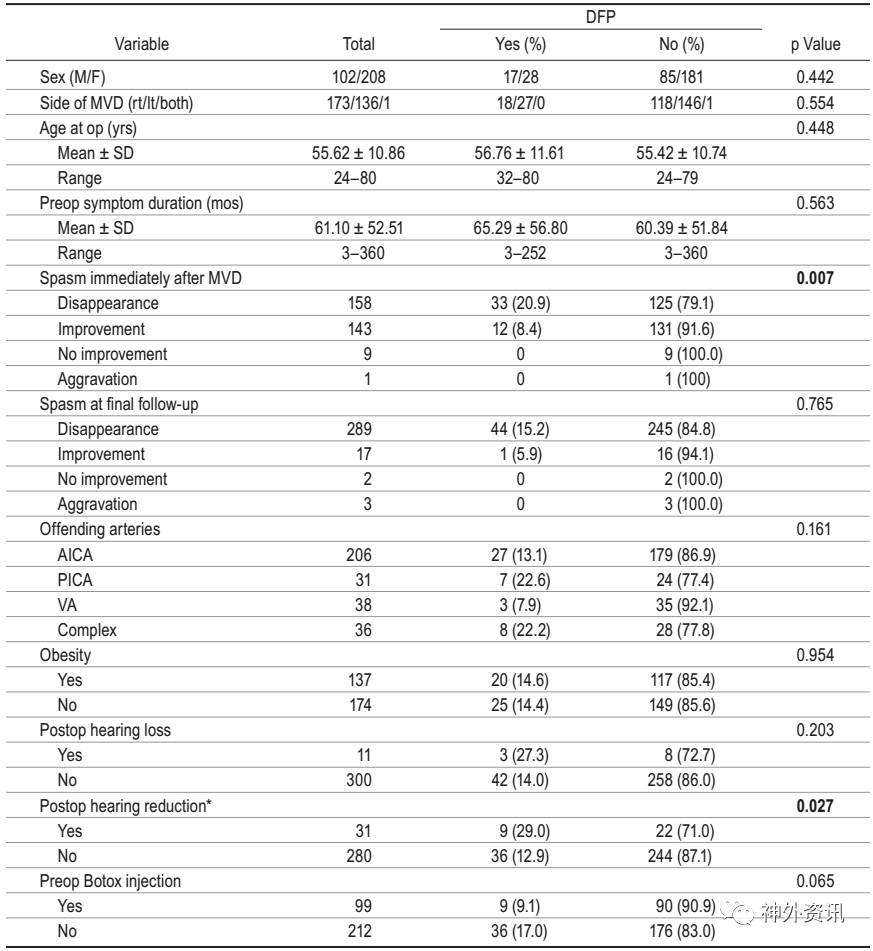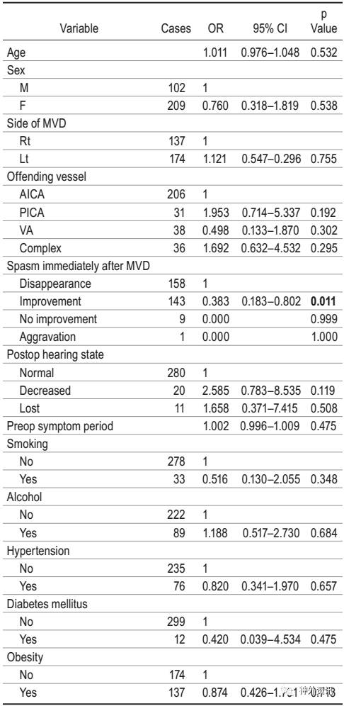 结果显示,MVD术后面肌痉挛即刻治愈的患者158例(50.8%),最终治愈的患者共289例(92.9%)。在45例并发DFP的患者中,17例男性,28例女性。DFP发生在术后第1天至第44天,平均9.67天。最后,44例(97.8%)完全康复;康复时间为1-24个月,平均3.9个月。对于HFS即刻治愈的患者,其并发DFP的发生率明显高于非即刻治愈的患者,OR=0.383;95% CI 0.183-0.802(p=0.011)(表2)。另外,术前肉毒素注射对DFP的发生存在负面影响(p=0.016)。
