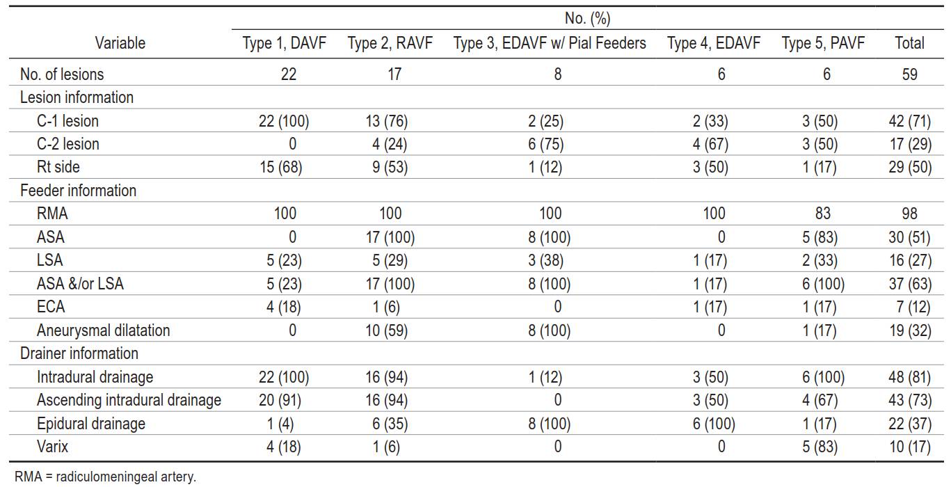 54例患者的CCJ区共有59个AVF病灶。依据供血动脉、瘘口位置和引流静脉,分为5型。1型:硬脊膜动静脉瘘(DAVF)22个(37%);2型:根动脉型动静脉瘘(RAVF)17个(29%);3型:伴有软膜支供血的硬膜外动静脉瘘(EDAVF with pial feeders)8个(14%);4型:硬膜外动静脉瘘(EDAVF)6个(10%);5型:髓周动静脉瘘(PAVF)6个(10%)(图1)。