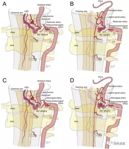 该研究表明CCJ区AVF血管构筑比以往认识的更为复杂,并提出新的分型系统,即以根脊膜AVF(Radiculomeningeal AVF)为基础的分型。CCJ区AVF常以出血为主要临床表现,其供血动脉主要是根脊膜动脉和软脊膜支。瘘口沿着C1和C2神经根分布,可位于脊髓、脊神经根或硬脊膜的内层或外层。