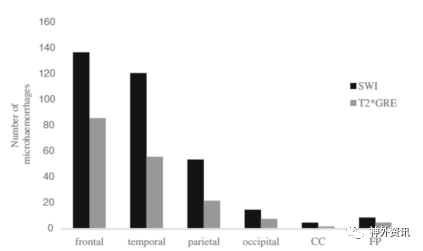 结果显示,与T2*GRE序列相比,采用SWI序列检测到微小出血的数量几乎翻1倍,341个比179个(p<0.01)。病变多出现在额叶和颞叶。两种序列检测到的微出血数量在皮质与皮质下的分布非常接近;SWI序列:皮质185个比皮质下156个;T2*GRE序列:皮质96个比皮质下83个(图2)。